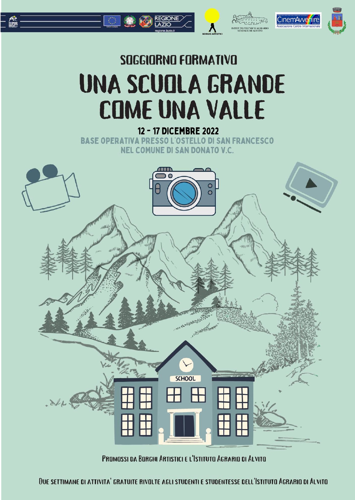 Borghi Artistici Impresa Sociale, il Comune di San Donato Val di Comino e l'Isituto Tecnico Agrario di Alvito, in collaborazione con l'Associazione Centro Internazionale CinemAvvenire, Coop. Verdeblu, Festival delle Storie, Rise Hub, Agriturismo Grancassa e Casa Marciegl, Museo del Novecento e della Shoah del Comune di San Donato Val di Comino, hanno realizzato il progetto UNA SCUOLA GRANDE COME UNA VALLE, progetto di soggiorno gratuito con attività formative nell'ambito della fotografia e del videomaking. Il progetto di soggiorno ha previsto anche, uscete territoriali e pernotti presso l'Ostello di San Donato Val di Comino. L'intero soggiorno, ha previsto l'organizzazione di pranzi e cene, presso aziende locali e attività di ristorazione del territorio, al fine di consentire una maggiore scoperta del patrimonio locale, dal punto di vista culturale, storico ec eno-gastronomico.